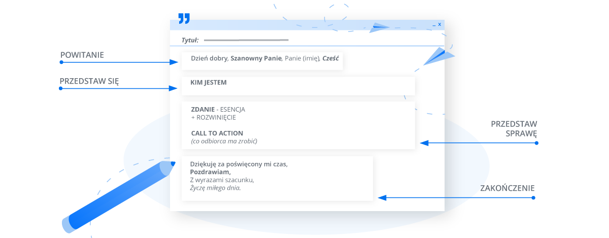 Zacznij od zdania – esencji. Możesz sparafrazować to, co napisałeś w linii tytułowej – zwięźle powiedz o co Ci chodzi. Nie licz na to, że osoba, która otrzymuje setki maili dziennie będzie się przekopywać przez długą wiadomość, by ustalić czego od niej chcesz. W kolejnych zdaniach możesz nieco rozwinąć temat, ale – pamiętaj – zwięźle! Więcej osiągniesz trzymając się zasady “less is more” niż pisząc elaborat. Prawdopodobnie Twoja wiadomość nie ma czysto informacyjnego charakteru, tylko kryje się za nią chęć zaangażowania odbiorcy w jakąś aktywność. W czytelny sposób przedstaw propozycję działania, którego oczekujesz od odbiorcy. Najlepiej wyrazić się wprost, na przykład używając zdania typu: Jeśli jest Pan/Pani zainteresowany/a …… uprzejmie proszę o ………